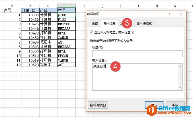 点击“数据验证—输入信息”,在输入信息中“联想品牌”。(下图4处)