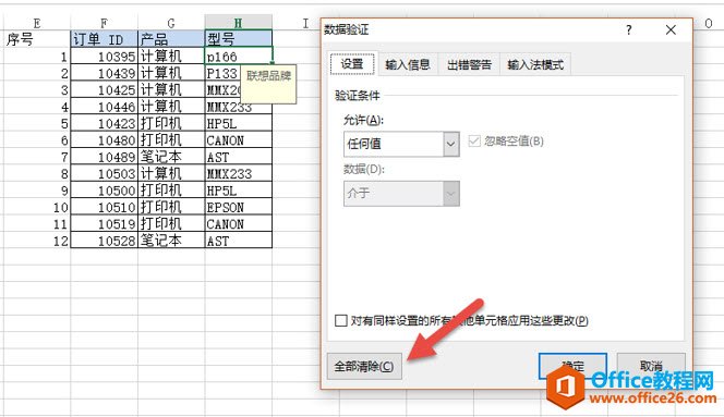 点击“数据—数据验证—数据验证”进入数据验证的设置窗口,点击左下角的“全部清除”按钮即可。(下图箭头处)