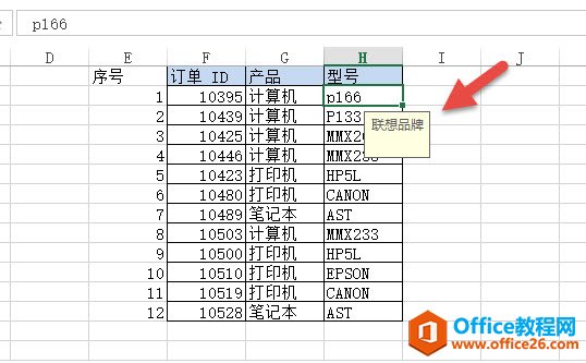 单击确定后,点击P166单元格就会出现“联想品牌”的提示。