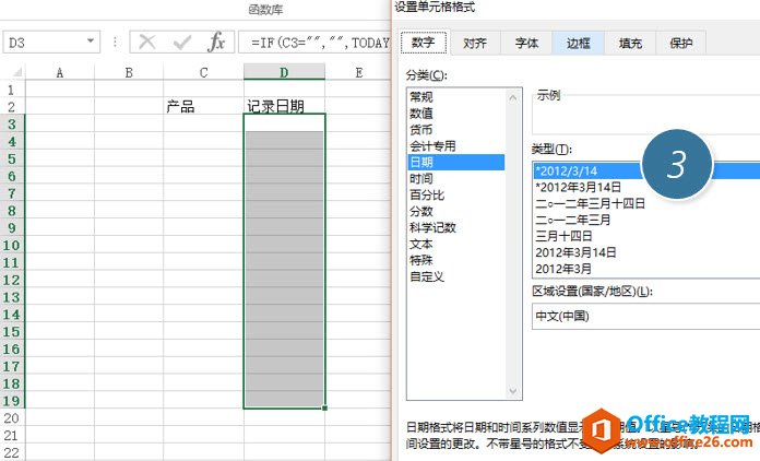还没完,记得选中D3:D19,按住Ctrl+1键,在设置单元格格式,在“日期”选中以下类型。(下图3处)