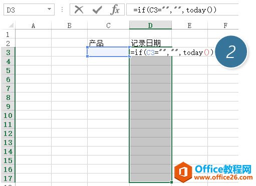 接着D输入函数:=IF(C3=””,””,TODAY()) ,意思也很简单,如果C3单元格不为空,则显示当前日期,否者就D3就为空。输入后,按Ctrl+Enter 将公式复制到D3:D17 。(下图2处)