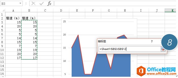 此时图表的横坐标数据变成实际数据。如下图 9 处。