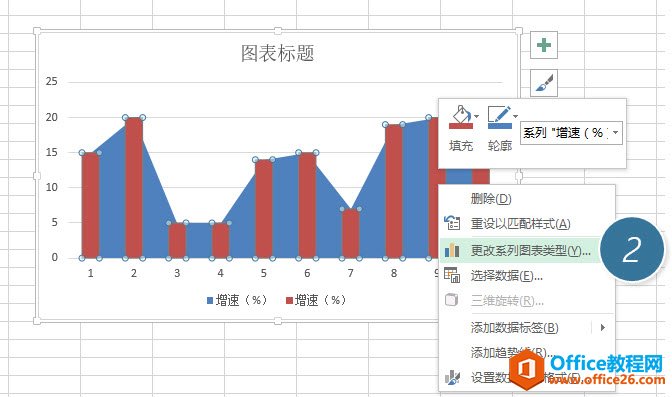 紧接着,选中柱形图,点击鼠标右键,在新弹菜单中“更改系列图表类型”。(下图 2 处)