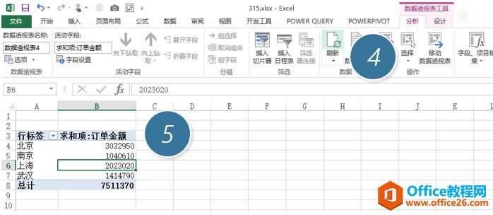 点击透视表中任意单元格,点鼠标右键,单击“数据透视表选项”按钮。(下图6处)