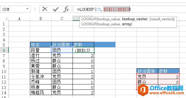 就是查询C列政治面貌与F列的政治面貌匹配,对应G列的参数。