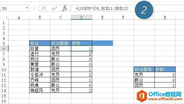 所以请记住,用Lookup函数,基准表的首列必须做升序,否者使用Lookup函数就会报错。此外如果基准表的数据如果是连接在一起的情况,正如本例“政治面貌”和“参数”紧挨在一起的。那还可以使用Lookup的数值表达方式,用两个参数搞定,效果如下:(下图 2 处)图