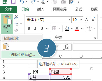 首先还是复制设置好格式的图表,和图1 处一样,只是这第二步操作在这里,点击“开始-黏贴-黏贴选项-选择性黏贴”按钮。这里注意看选择性黏贴的快捷键(Ctrl+ALT+V) 下图 3 处。