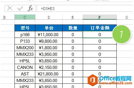首先,将“数量”设置为“0”,然后在“订单金额”把计算公式设置好。(下图1处)