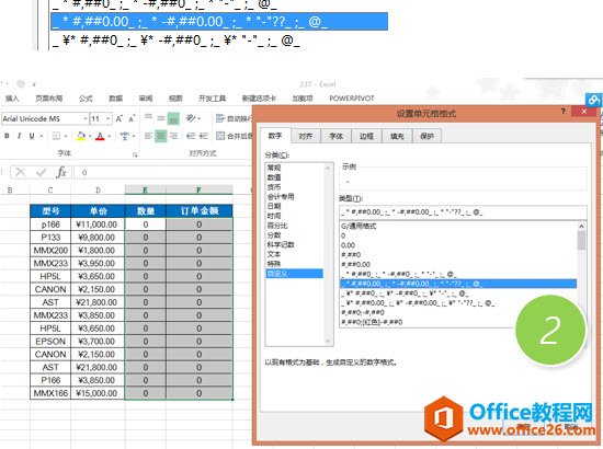 然后选中下图中所有的“0”单元格,然后按Ctrl+1打开单元格格式设置,在自定义处,选择下图中系统自带的格式类型。(下图2处)