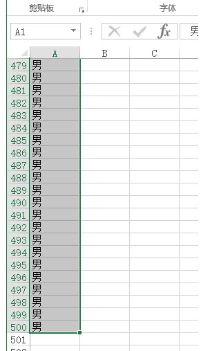 接下来,敲回车键,系统就会自动把A1:A500选中,然后用键盘敲入“男”字。这个字会自动写入第一个白色空白单元格。如下图2处。