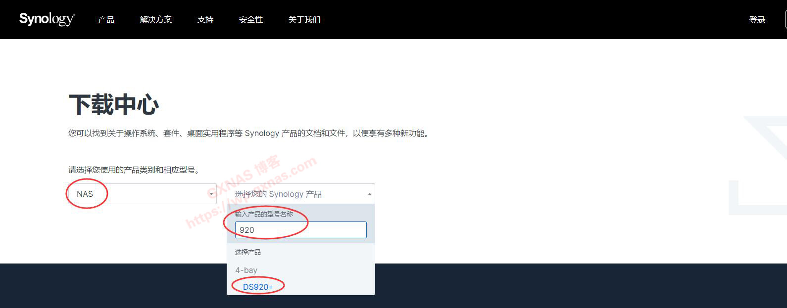 2、产品类型选“NAS”,型号根据实际情况选择你的群晖机器型号,本文以DS920+为例,在产品型号栏输入920,会看到有DS920+这个型号,点击“DS920+”;