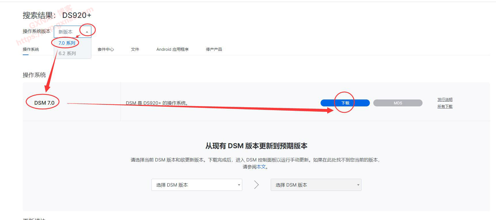 3、在弹出的界面上“操作系统版本”点小三角符号选择“7.0 系列”,在下方的“DSM 7.0”的右边,有个“下载”按钮,点它,把系统安装包下载到电脑上;