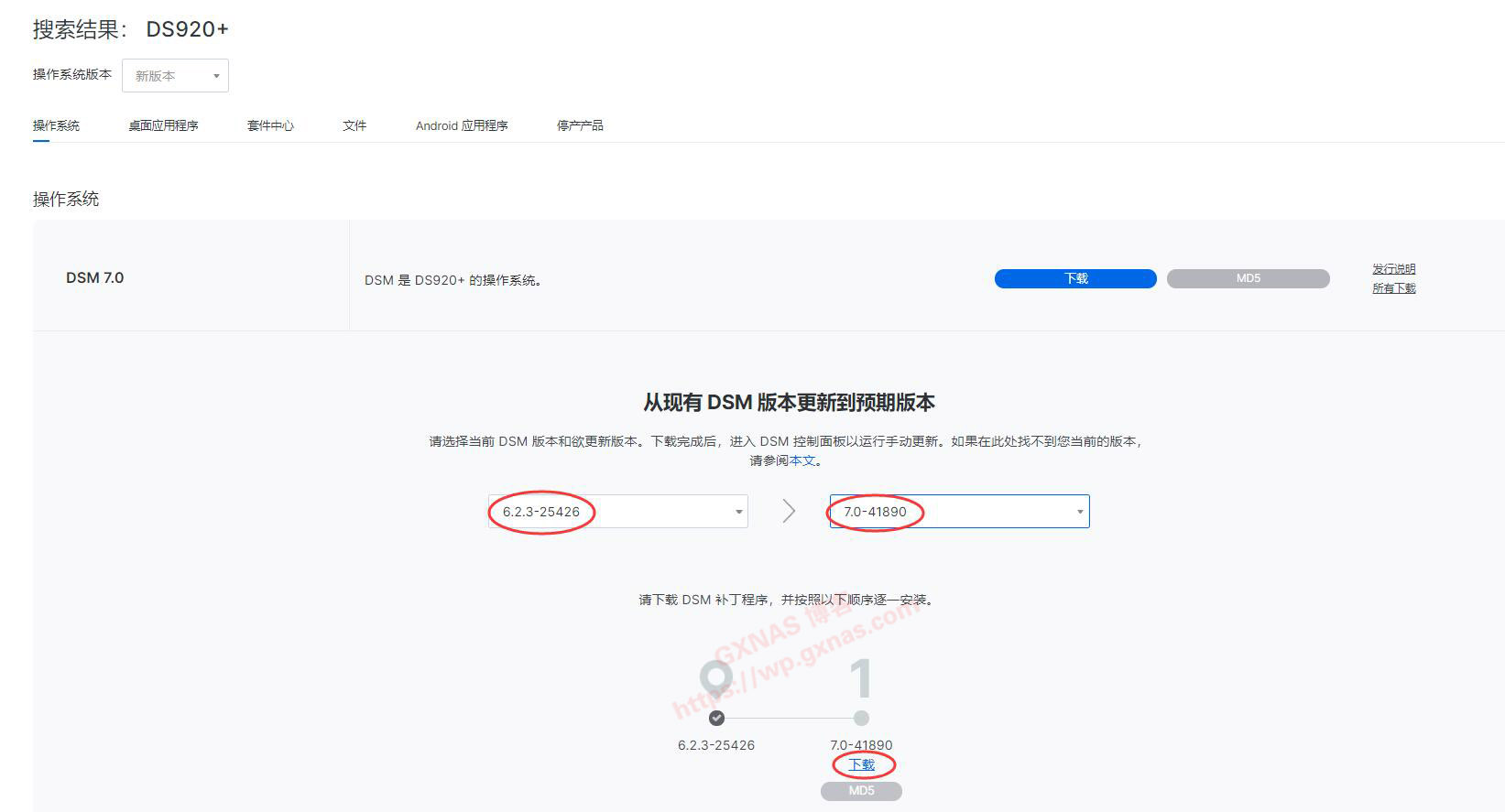 3、在弹出的界面上“操作系统版本”点小三角符号选择“7.0 系列”,在下方的“从现有的DSM版本更新到预期版本”这个地方根据实际情况选择。以本文为例,把DSM920+的6.23-25426版本升级到DSM7.0-41890版本,所以在左边栏选择的DSM版本是6.23-25426,右边栏选择7.0-41890。选好以后,就会看到有升级包可以下载,点蓝色的链接把安装包下载到电脑;