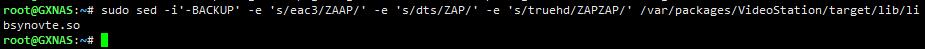 sudo sed -i'-BACKUP' -e 's/eac3/ZAAP/' -e 's/dts/ZAP/' -e 's/truehd/ZAPZAP/' /var/packages/VideoStation/target/lib/libsynovte.sosudo mv /var/packages/VideoStation/target/bin/ffmpeg /var/packages/VideoStation/target/bin/ffmpeg-BACKUPsudo mv /var/packages/VideoStation/target/bin/ffprobe /var/packages/VideoStation/target/bin/ffprobe-BACKUPsudo mv /var/packages/VideoStation/target/bin/vainfo /var/packages/VideoStation/target/bin/vainfo-BACKUP