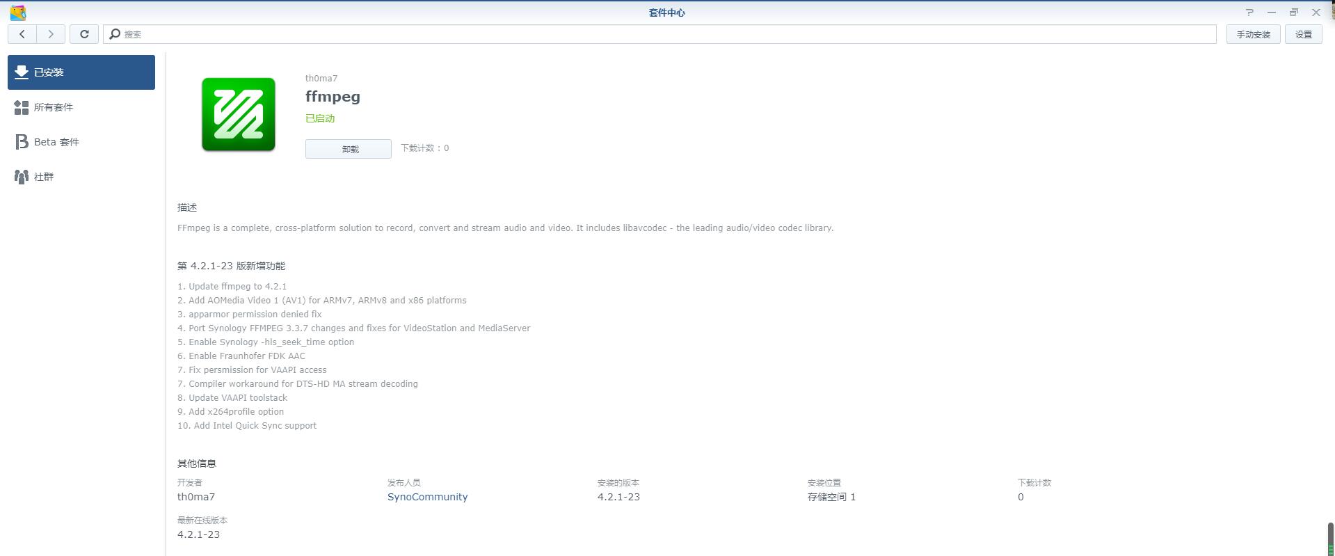 如果按照上述方法不能正常安装ffmpeg套件的,可以到这个地址:https://github.com/th0ma7/synology/tree/master/packages