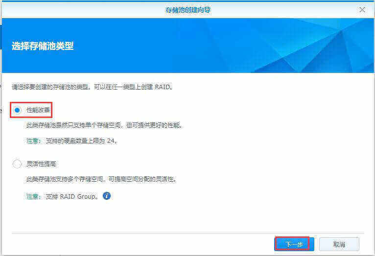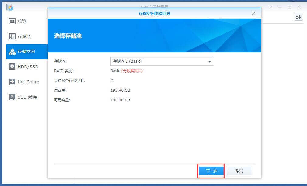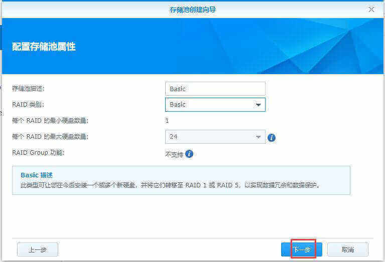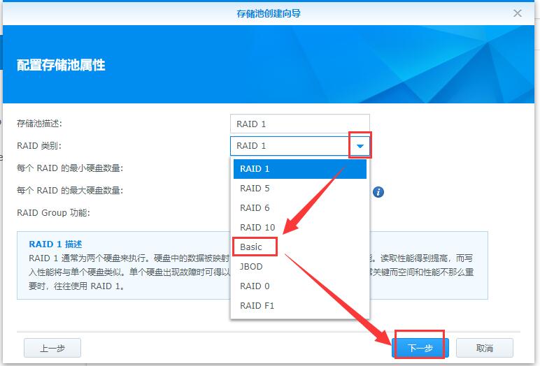 63、根据实际情况选择RAID类型,本教程只建立一个存储盘,所以只能选择:Basic,下一步;