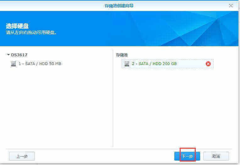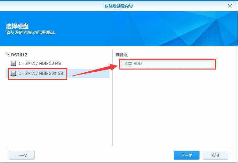 65、把左边的磁盘2 – SATA/HDD 200GB,用鼠标点住不放手,并且拖动到右边存储池的“所需HDD”区域,松开鼠标;