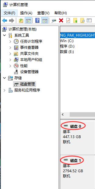3)至于是添加哪个硬盘,可以在设备管理器里面的“磁盘管理”查询硬盘序号,上图的“PhysicalDirve0”对应下图的“硬盘0”,上图的“PhysicalDirve1”对应下图的“硬盘1”,以此类推。