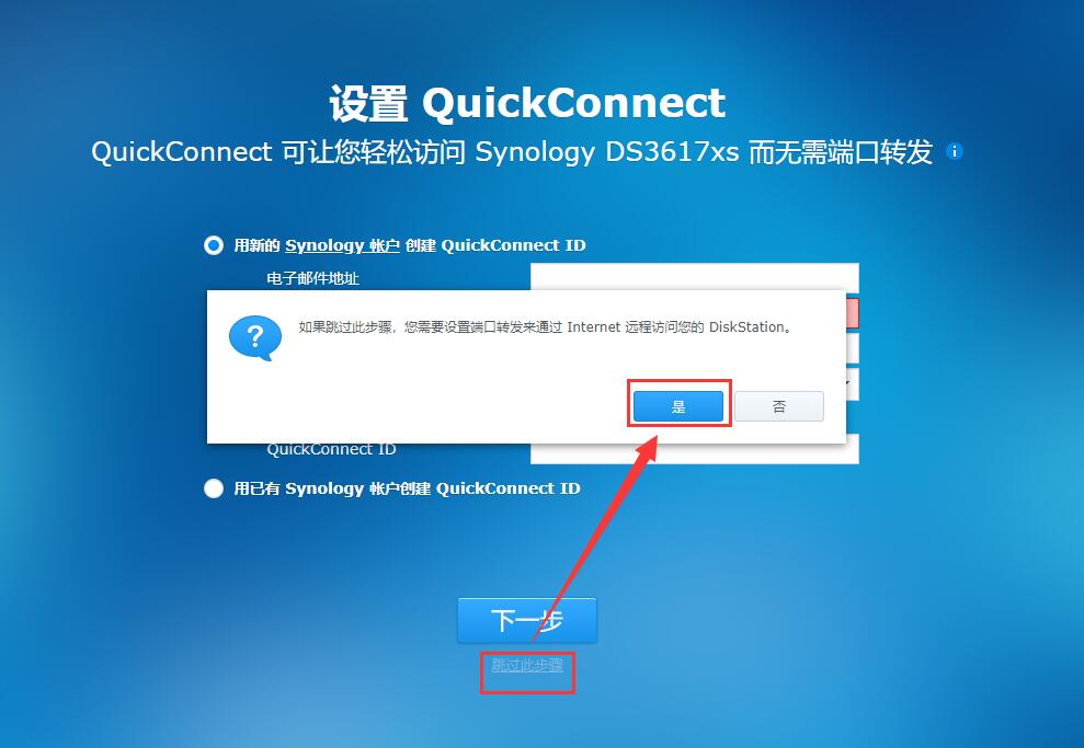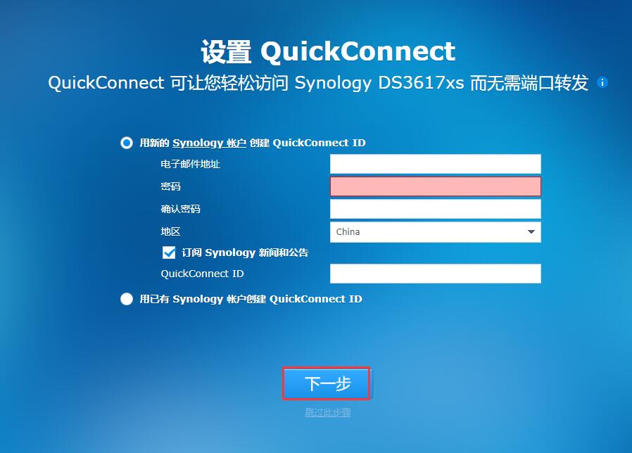 (2)如果你是买官方机器的白群用户,并且已经已经有QC账号,可以选择“用已有synology账户创建QuickConnect”,在这输入原有QC的ID;
