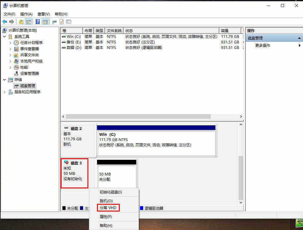 23、回到win系统的磁盘管理,找到刚才新建的那个50MB的磁盘,右键,分享VHD;