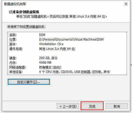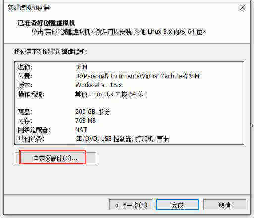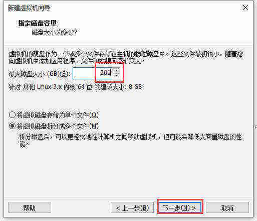 5、根据自己的需求,给群晖虚拟机分配存储空间,本文以添加200G虚拟硬盘为例(如果直通整个硬盘请参考本文末段的补充说明);