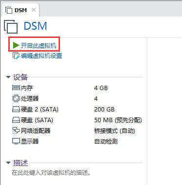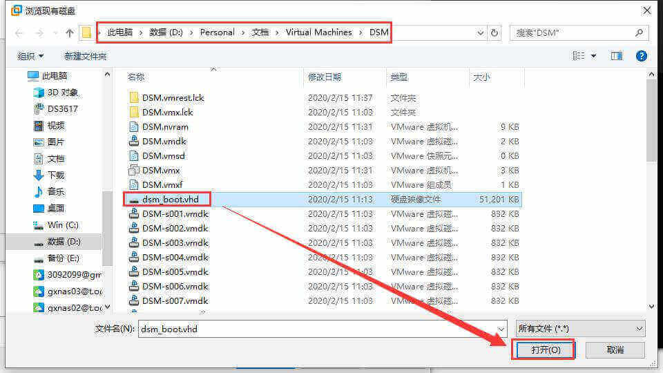 41、找到第4步、第5步我们添加的200G的虚拟磁盘:DSM.vmdk,打开;