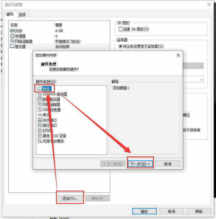 2)在设备这里,根据实际情况,选择你要添加给群晖虚拟机使用的物理磁盘,下一步;