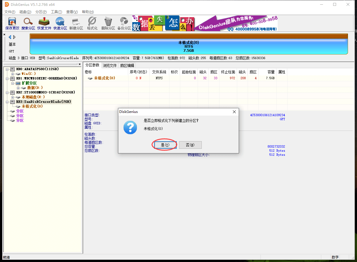 11、 点“是”,对U盘进行格式化;