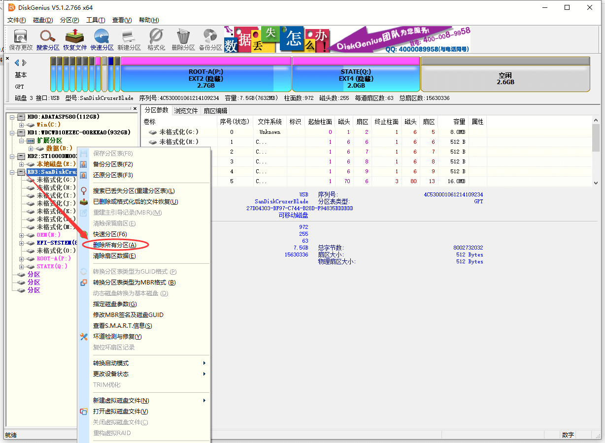 1、用DiskGenius查看U盘分区,如果你的U盘分区只有1个,则这一步骤可以略过;如果U盘没有分区,则需要按照第6步建立一个分区。由于本教程U盘已经大于1个,所以需要把U盘的分区全部删除,再重新建立一个分区。
