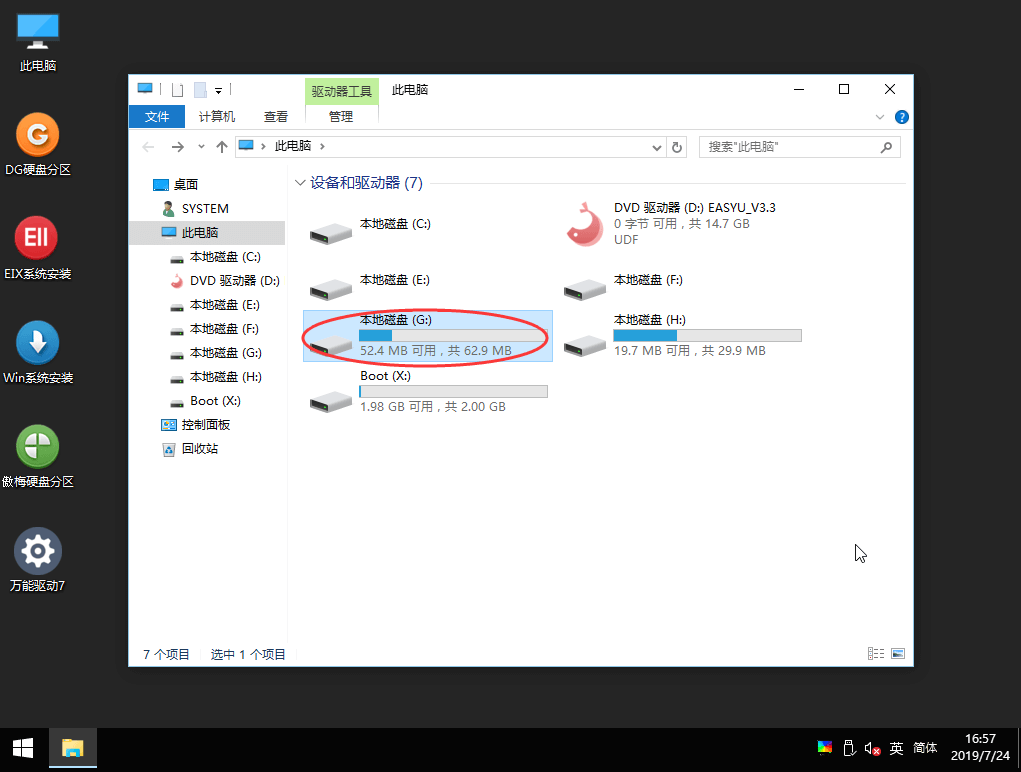 2、打开容量大小为62.9M的盘(本教程为G盘),双击打开;