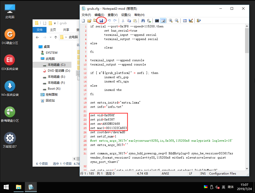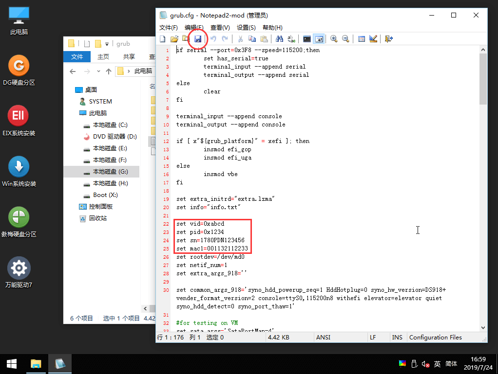 5、大约第22行到25行处,根据实际情况修改VID、PID、SN、MAC,修改完记得点一下左上角的保存后退出,然后拨掉U盘,重启机器;