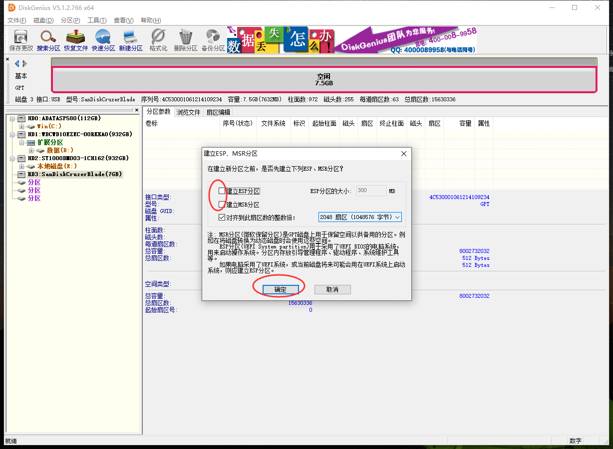 7、 不要勾选“建立ESP分区”和“建立MSR分区”,确定;