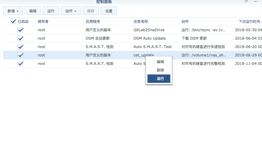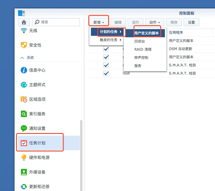 控制面板 / 任务计划 / 新增 / 计划的任务 / 用户自定义的脚本
